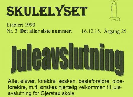 Siste skoledag før jul kom det siste skolelyset. I over 25 år har skoleavisa vår vært brukt til å spre informasjon og opplysninger om det arbeidet som er blitt gjort på skolen. Her har vi også skrevet om de ulike prosjekta skolen har deltatt i.