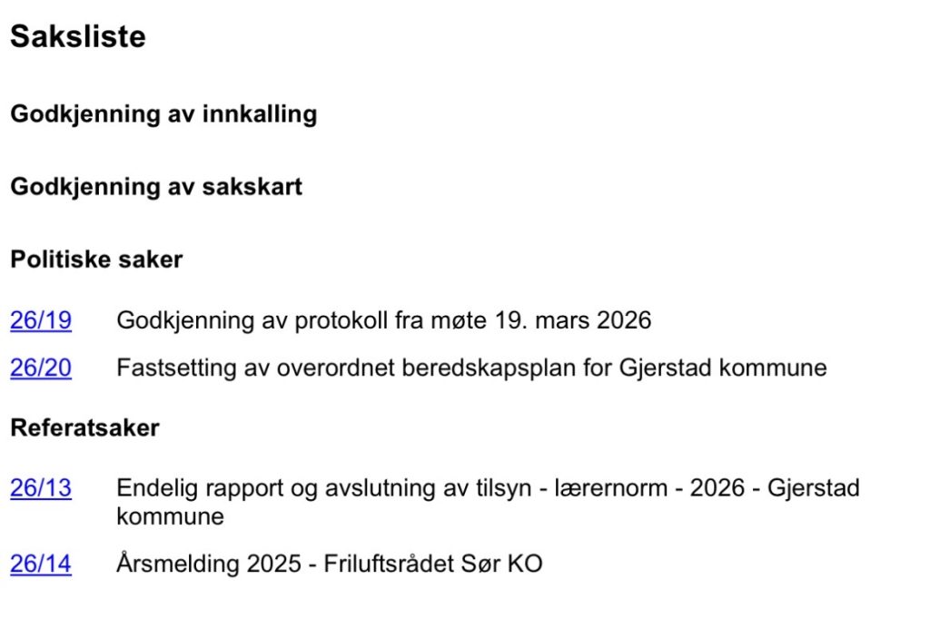 Tirsdag 28. mai kl. 17.00 har ordføreren i Gjerstad innkalt til ekstraordinært kommunestyremøte.