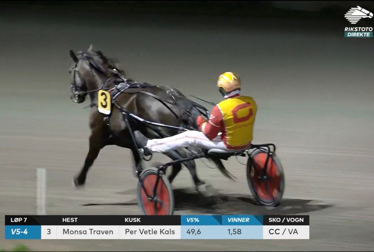 Per Vetle Kals satt bak tømmene og styrte hesten resolutt til tet fra start. Selv om det kom en hest og yppet seg litt gjennom siste sving, hadde Per Vetle full kontroll på hendelsene og stakk fra til en sikker seier og 14 tusenlapper i belønning for hestens eier.