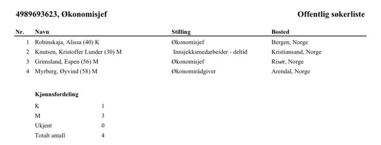 Share Facebook Twitter LinkedIn Pinterest Email Espen Grimsland, økonomisjef i Gjerstad kommune, ønsker seg ny jobb i tilsvarende stilling på Vegårshei. Dette kommer fram av den offentlige søkerlista på fire personer som har søkt jobben som ny økonomisjef i nabokommunen. Dette er søkerlisten: