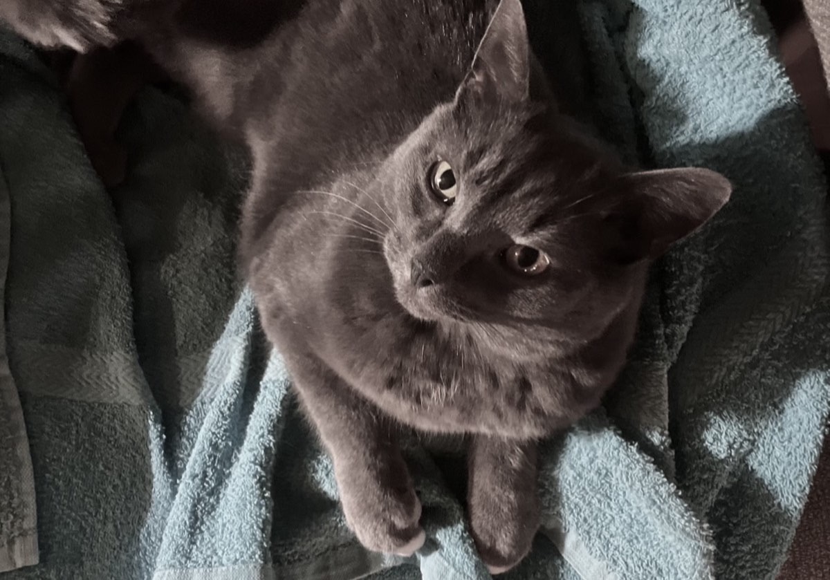 Katten er korthåret og helt grå, bortsett fra noe hvitt ytterst på på framlabbene.  Den ble sist sett i området Kveim/Apland/Klokkargården.