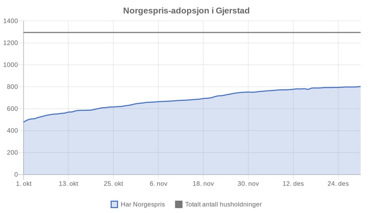 I Gjerstad kommune har nå 66,1% av husholdningene valgt Norgespris. Tallene viser at 70,7% i regionen (NO2) har gjort det samme.