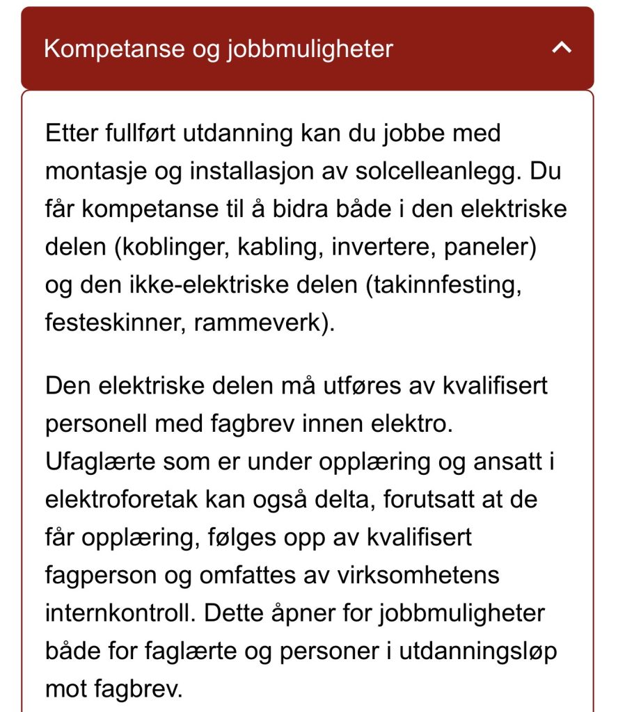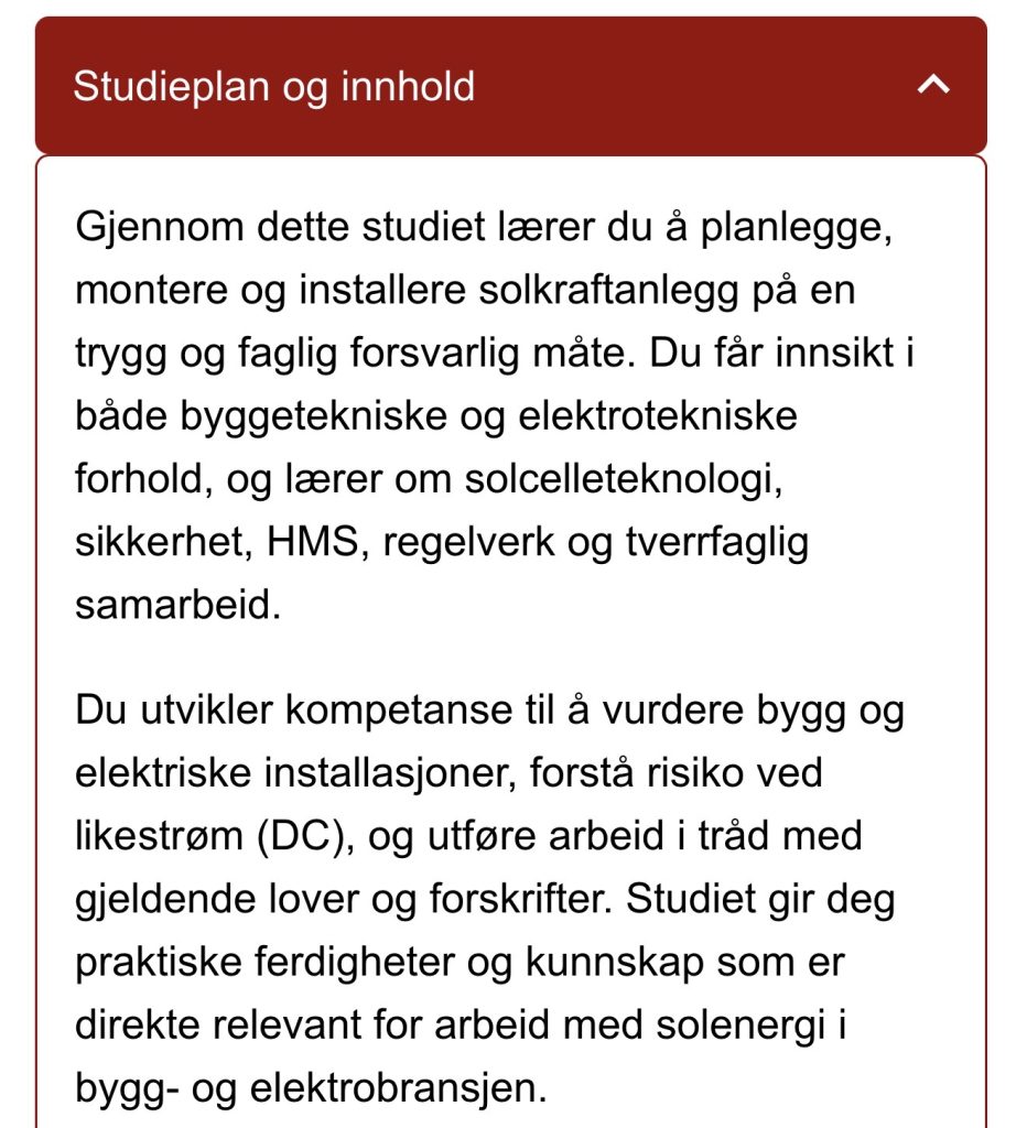 Solkraftbransjen er i rask utvikling, og behovet for kvalifisert personell øker. Etter fullført utdanning kan du jobbe med montasje og installasjon av solcelleanlegg – både den elektriske og ikke-elektriske delen – i samarbeid med elektroforetak. Studiet gir 5 studiepoeng og er tilrettelagt for fleksibel læring med digitale verktøy og praksisnære oppgaver.